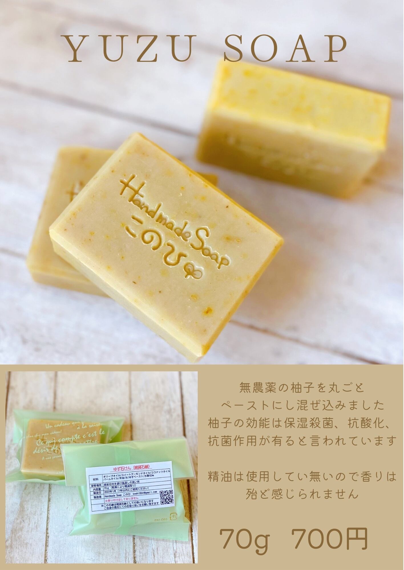 ◇スイートアーモンドオイル、オリーブオイル、ココナッツオイル、パームオイル、柚子(無農薬)ペースト、水、水酸化N a